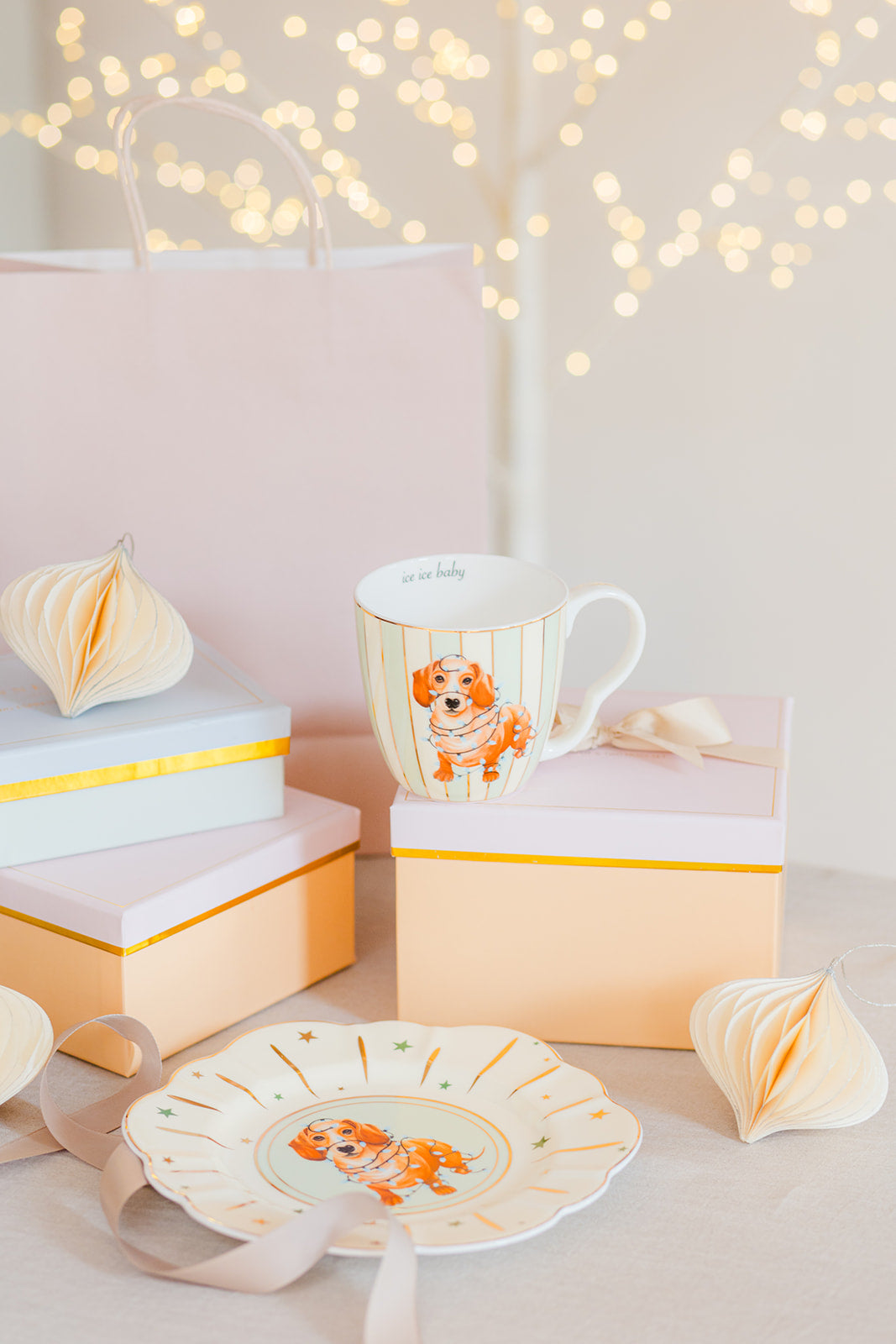 Serve up a touch of whimsy with our Sausage Doggie Mug and Cake Plate bundle. Featuring a cheeky sausage doggie tangled in fairy lights illustration, this mug and cake plate bundle adds a delightful and cozy feel to your cuppa experience. Made from bone china, it's perfect for everyday use or special occasions. Bring warmth and joy to your table with this adorable and stylish addition to your collection.
