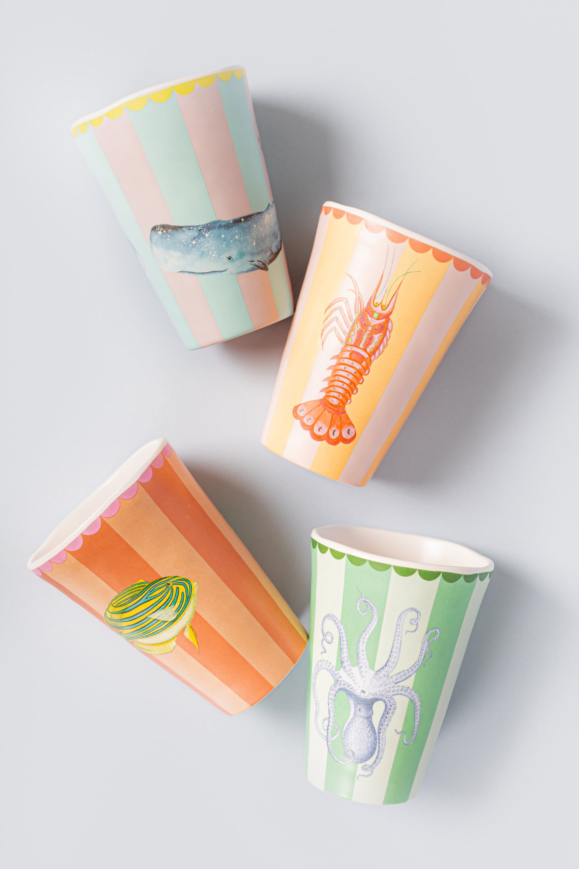 Bring a touch of under the sea to picnics and parties with these four quirky Picnic Cups. Each cup features a different Yvonne Ellen playful animal illustration on a stripe. Made of shatter-resistant matt melamine, they're dishwasher safe for everyday use. Matching dinnerware sets also available.