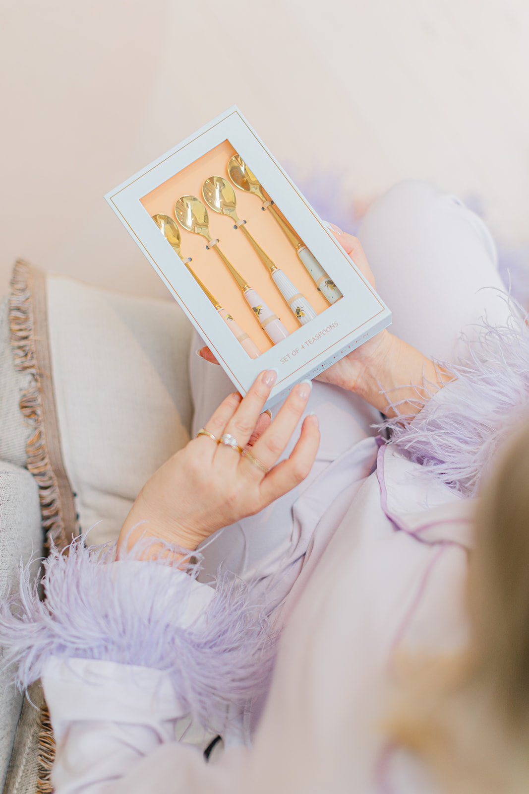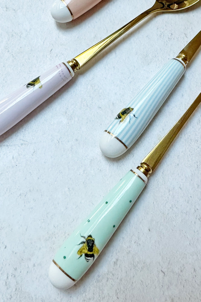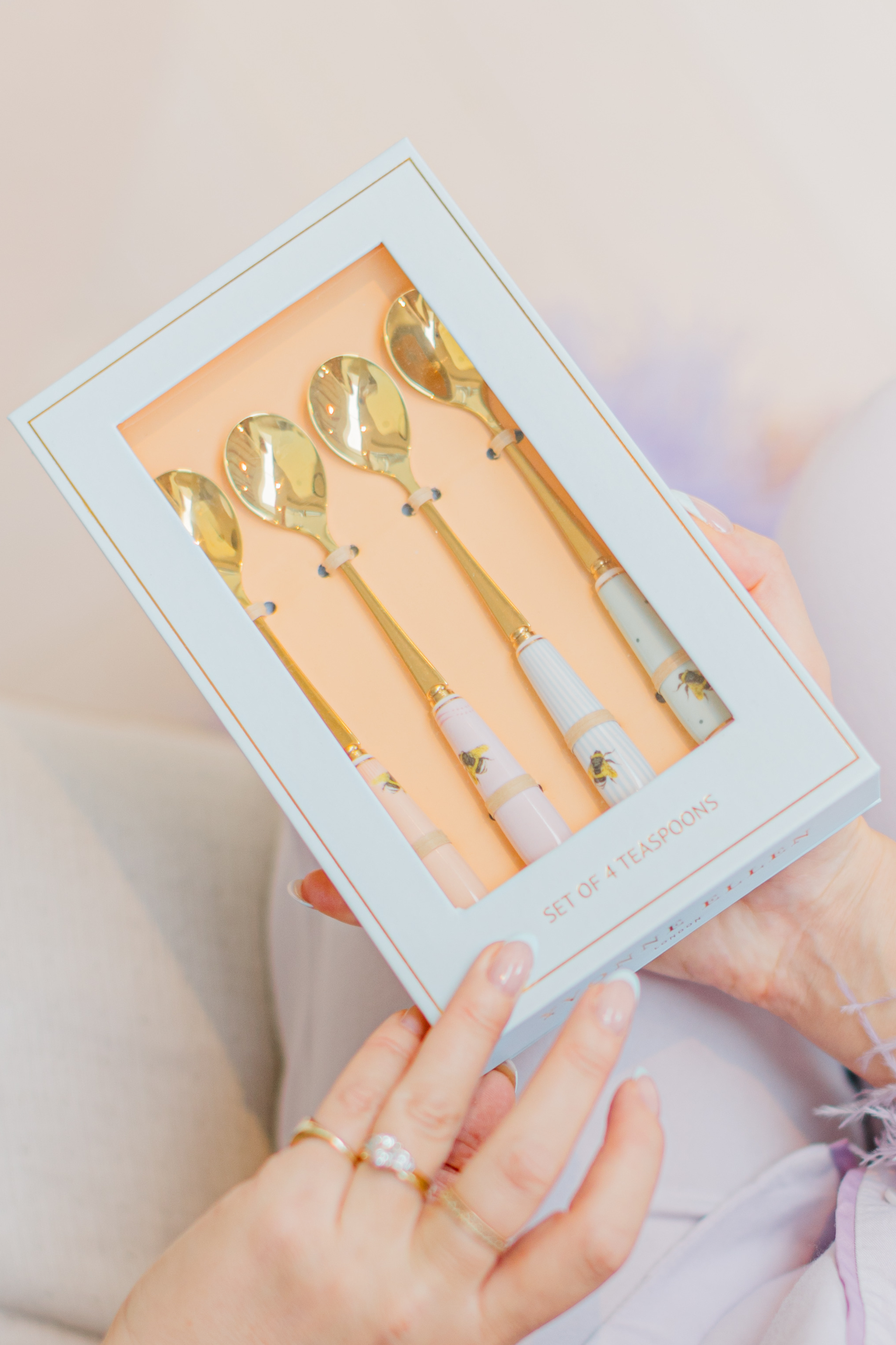 Both fun and refined, this set of four teaspoons have fine china handles and a polished gold-effect finish. Presented in a gorgeous box, this giftable set has my signature bee on them with mix-match pastel handles.