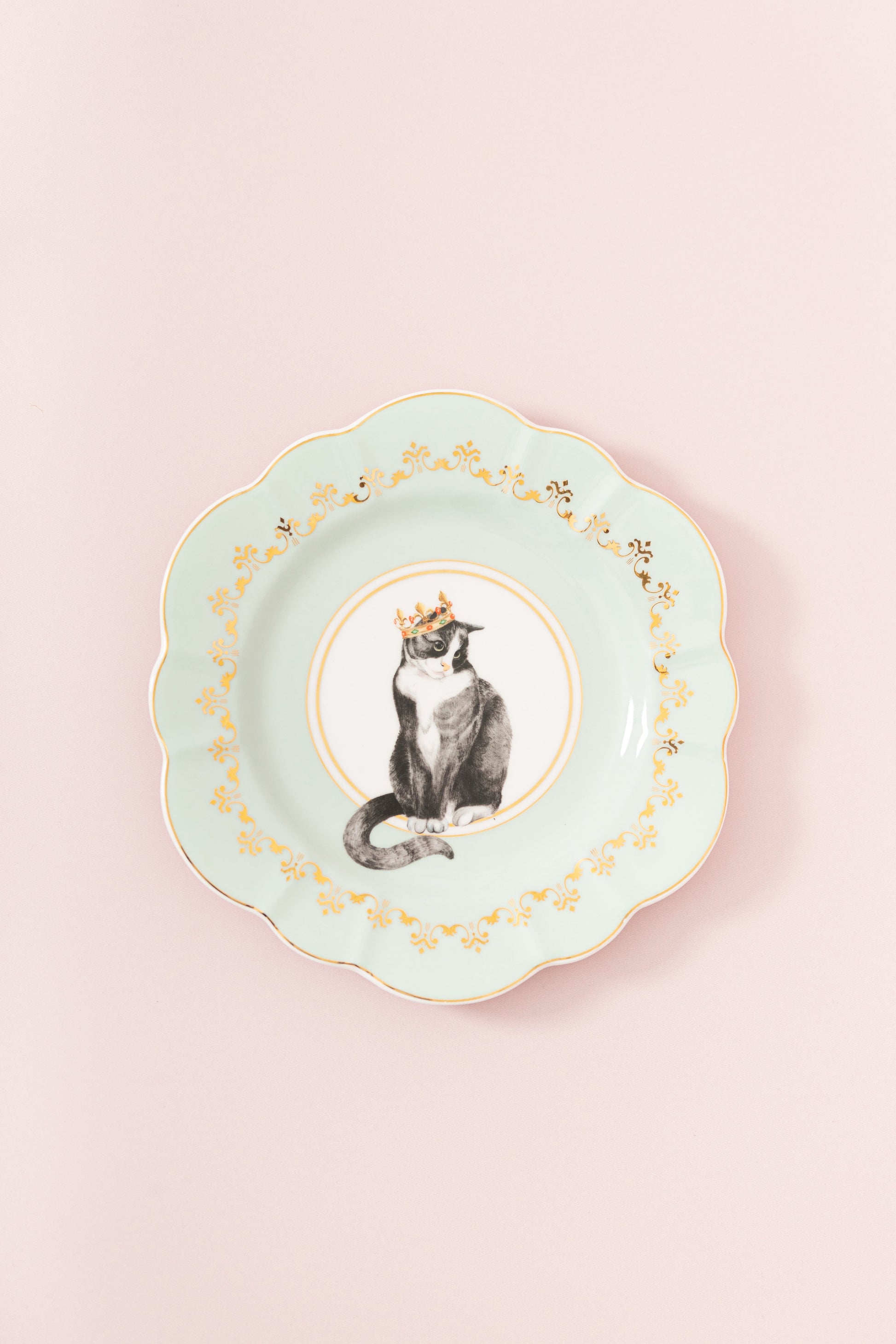 Indulge in the charm of England with our new "Best of British" range. Classic English animals meet vintage and royal-style gold accents on delightful tableware. From swans on teacups to pigeons on plates, each piece tells a whimsical tale. Our classic black cat sits regally on this plate with intricate gold detail on a soft pastel green background.