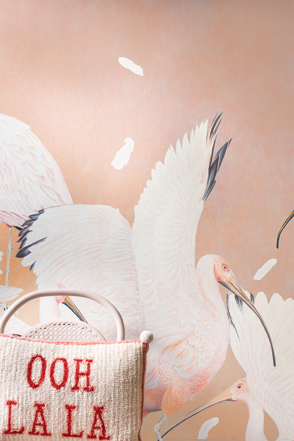 This stunning Birds of Paradise wall mural is reminiscent of antique Chinese paper screens or "pingfeng", and depicts a fantastical flock of scarlet Ibis wading on a beautifully clear wetland while fallen feathers float above.