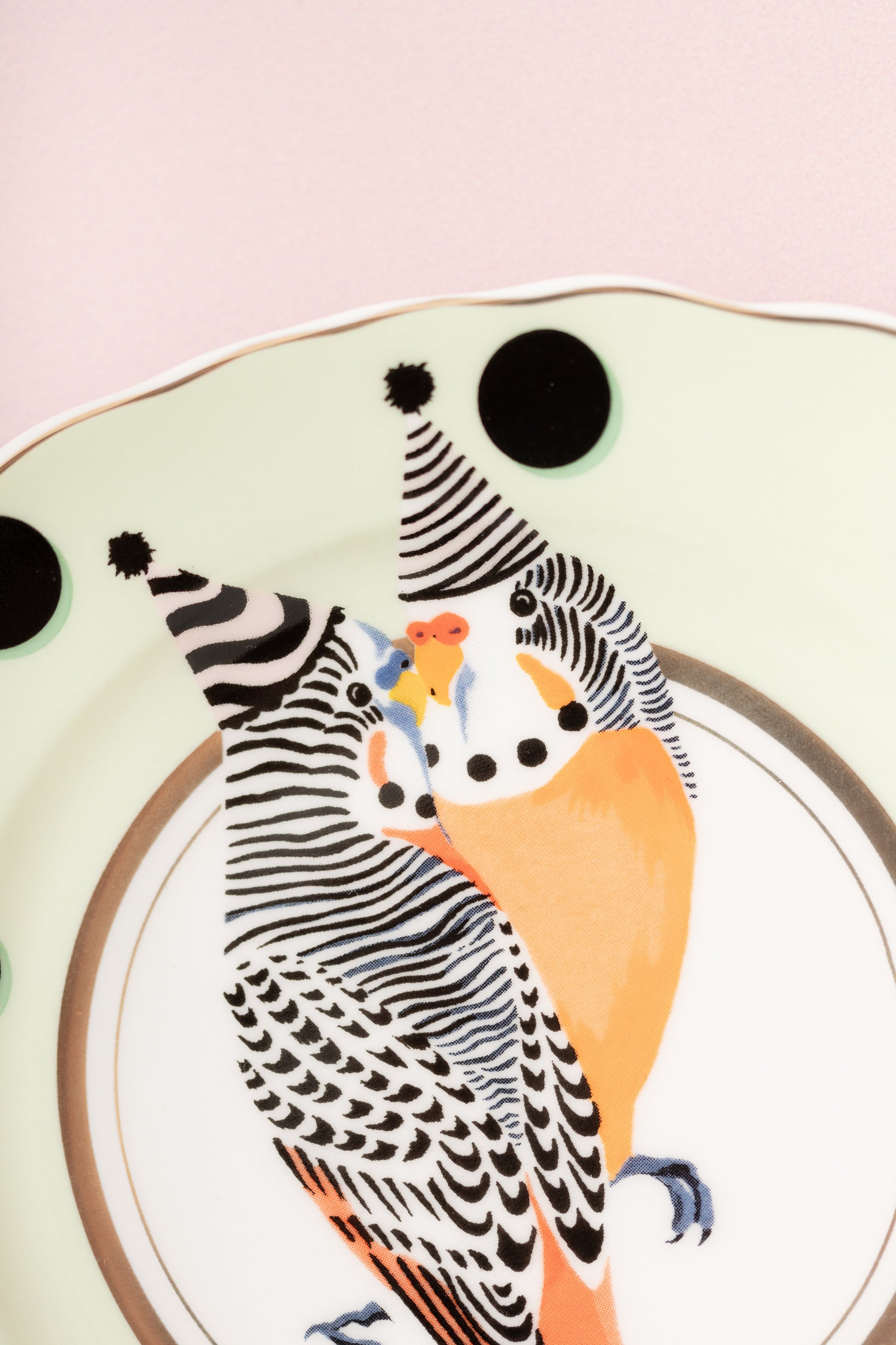 One of my favourites - The budgies sit proudly on this vintage style cake plate. A mint green pattern and gold foiling detail make this plate is perfect for decorating your next afternoon tea table. Totally adorable!!