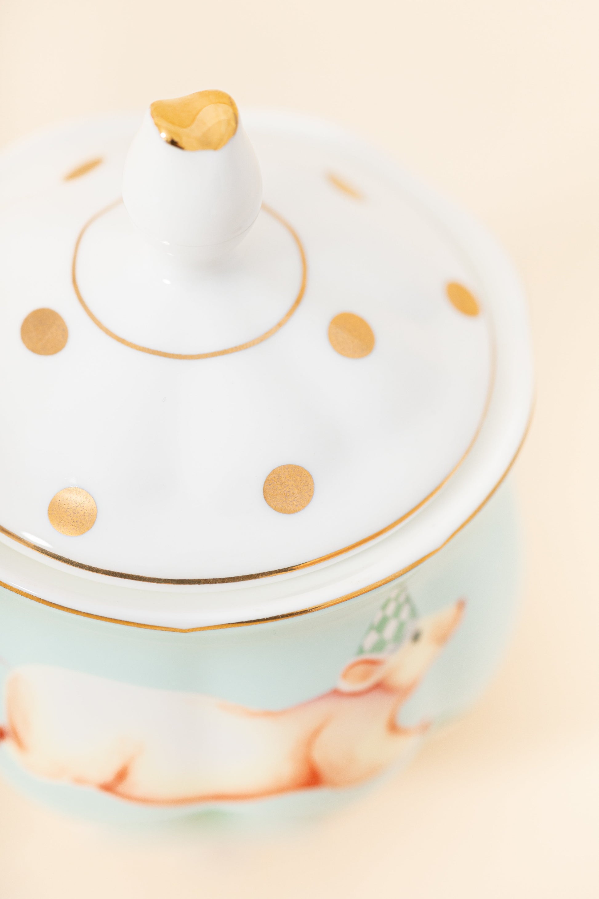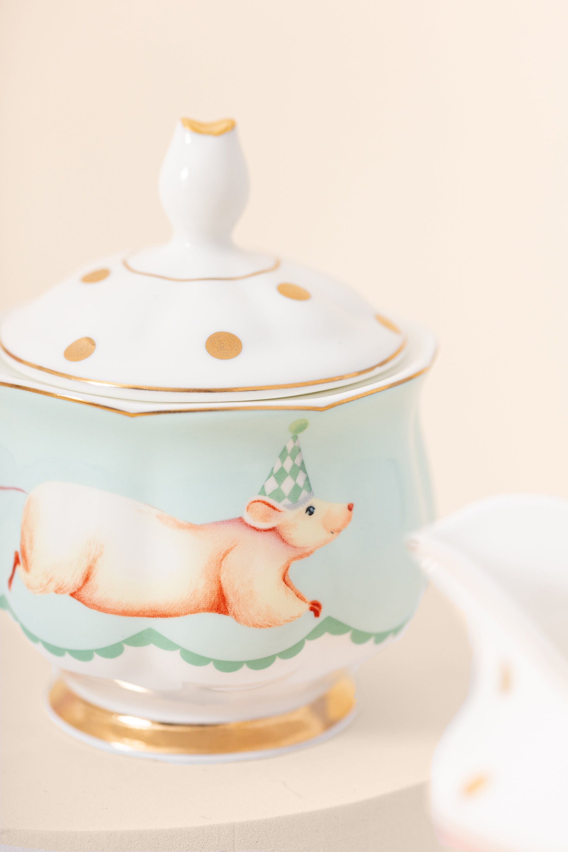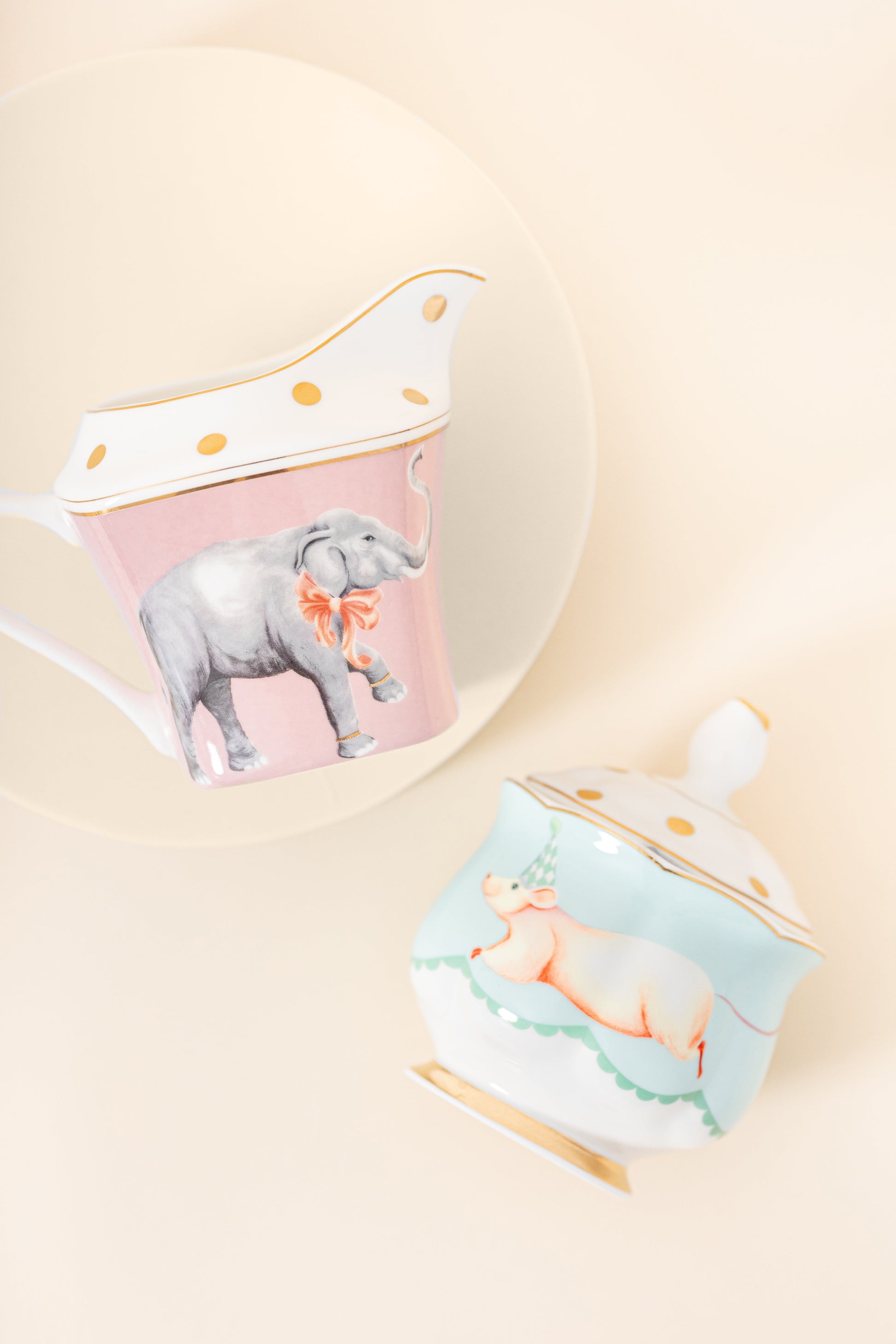 An iconic duo, our elephant and mouse on a milk jug and sugar pot combo! Ideal for afternoon tea parties, this vintage-style pink elephant Jug and blue mouse sugar pot are adorned with 22-carat gilt gold detailing. Fill with milk or cream and sugar, and add to the tray or table with your tea or coffee.