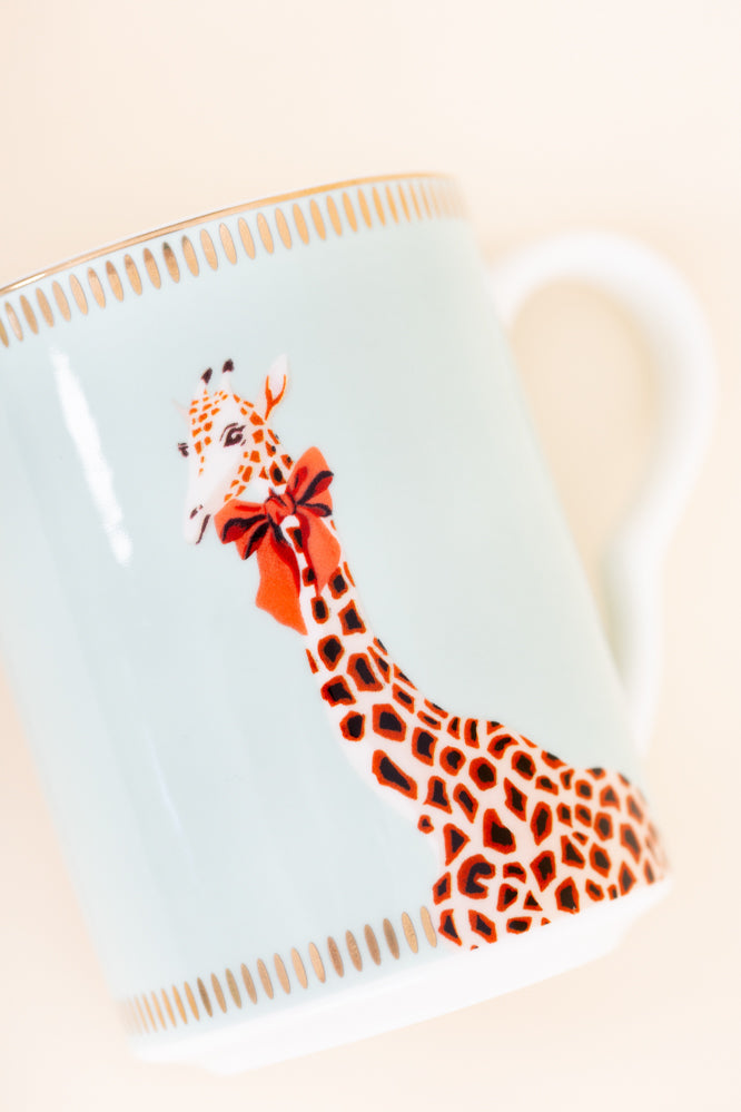 This mug is an ideal gift for birthday's, Christmas or just as a way to celebrate a loved one. This giraffe mug has a pastel blue background, a gold rim and detailing for extra elegance! Our favourite giraffe dressed with a red ribbon around their neck, adorns the sides of the mug and there's a hidden slogan inside!