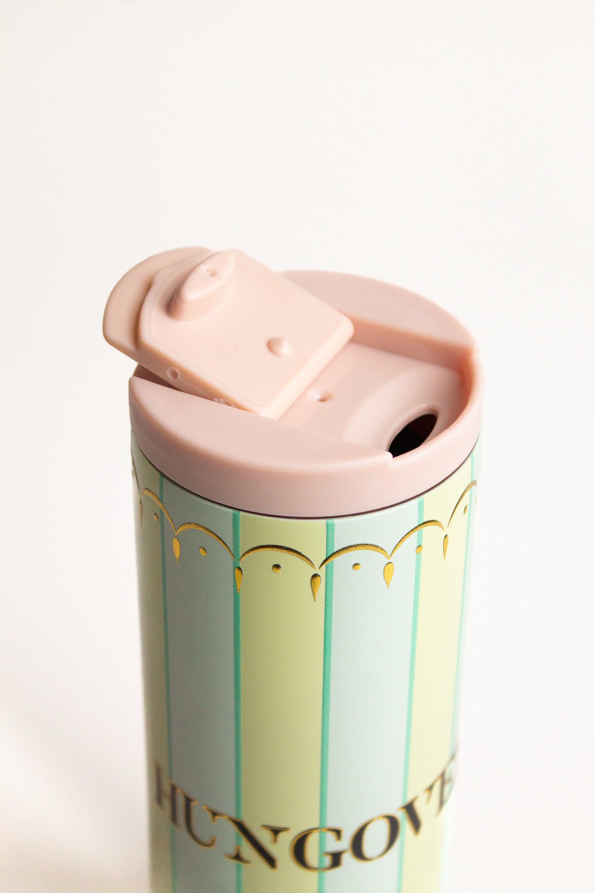 The perfect way to carry your Yvonne Ellen designs with you. This travel mug comes with a plastic lid to stop unwanted spillages, with a cute striped background. Finished with vintage inspired gold detail and a pastel lid, this cheeky slogan travel mug, is perfect for your daily commute.