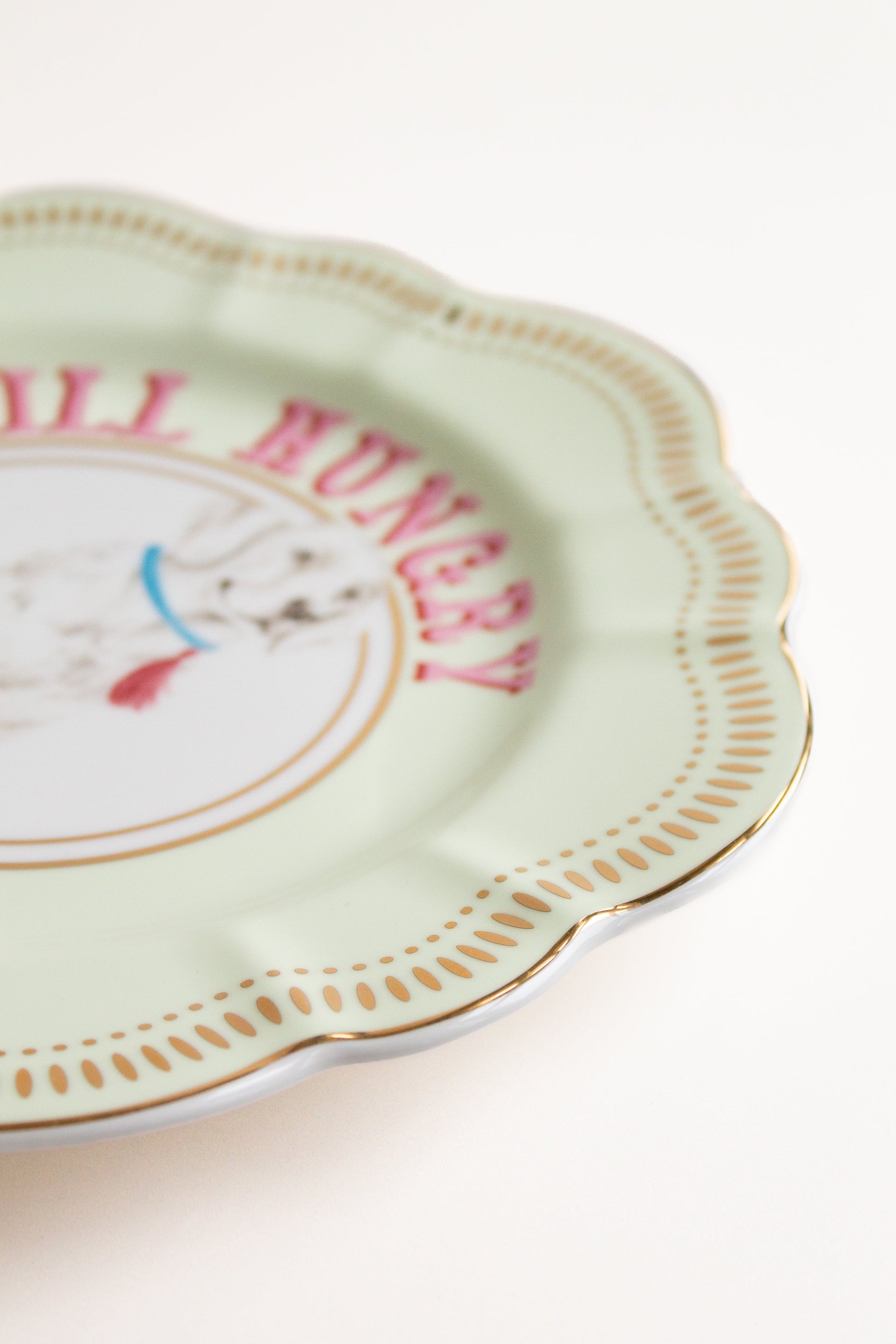 Introducing the Labrador flower plate! An iconic slogan and illustration combo adorn this plate. The scalloped edge make this plate sure to be the show stopper of your tableware collection! A pastel yellow background and gold foiling detail are tied together with a quirky slogan. So unique!