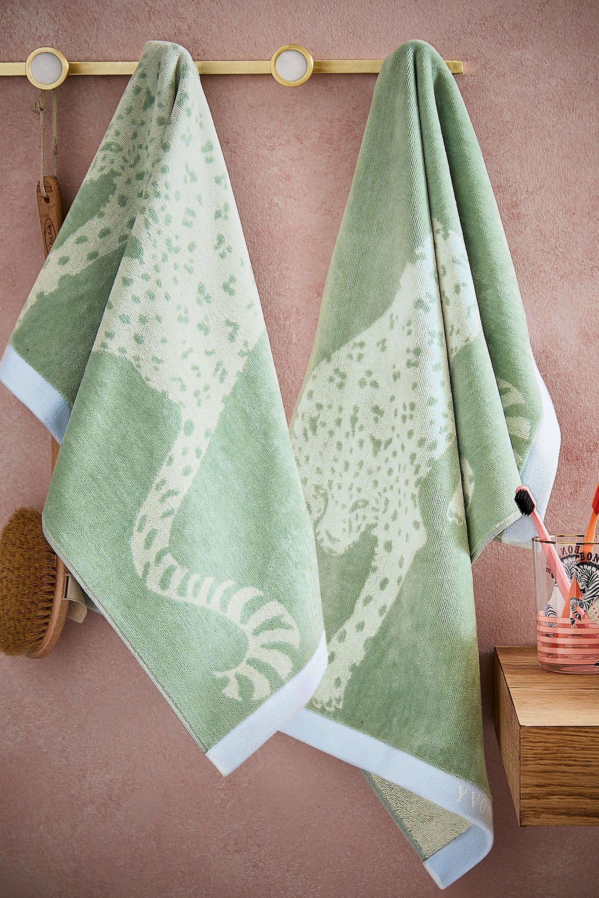 Add a statement touch to your bathroom with The Yvonne Ellen Leopard Towel. Woven in soft cotton velour, this design features Yvonne’s signature leopard motif on a gentle sage green background and is finished with a bold blue hem for a stylish contrast.