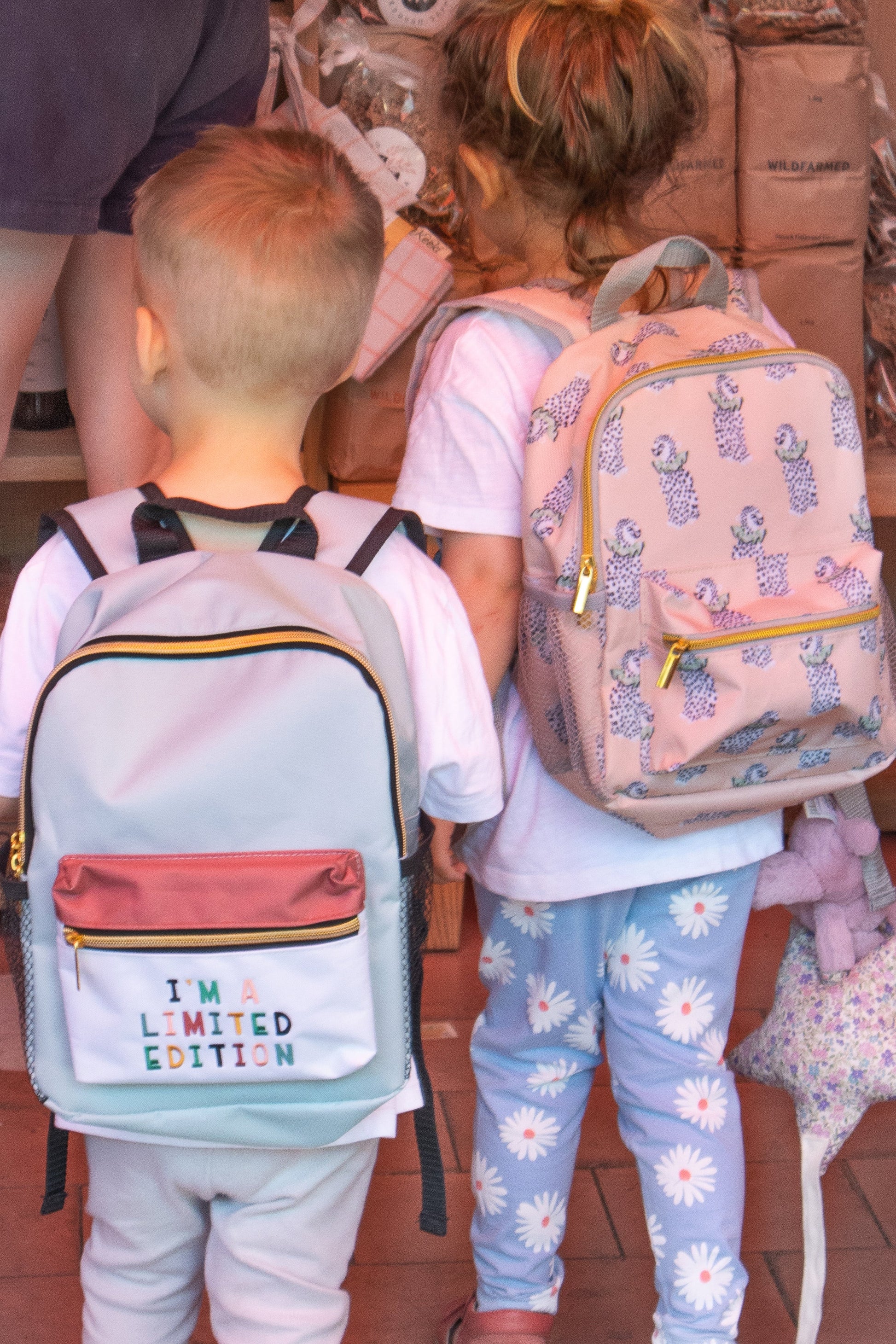 Bring a touch of the wild side to your kiddo's accessories with this fabulous cheetah backpack! Decorated with a cute Yvonne Ellen wild baby cheetah, printed on a soft peach background with a white and black star, wipe clean lining. The backpack is finished with funky gold zips, on the front pocket and main pocket and grey adjustable straps for a touch of quirkiness. It also has a handy mesh pocket for a drinks bottle. How Cute?!