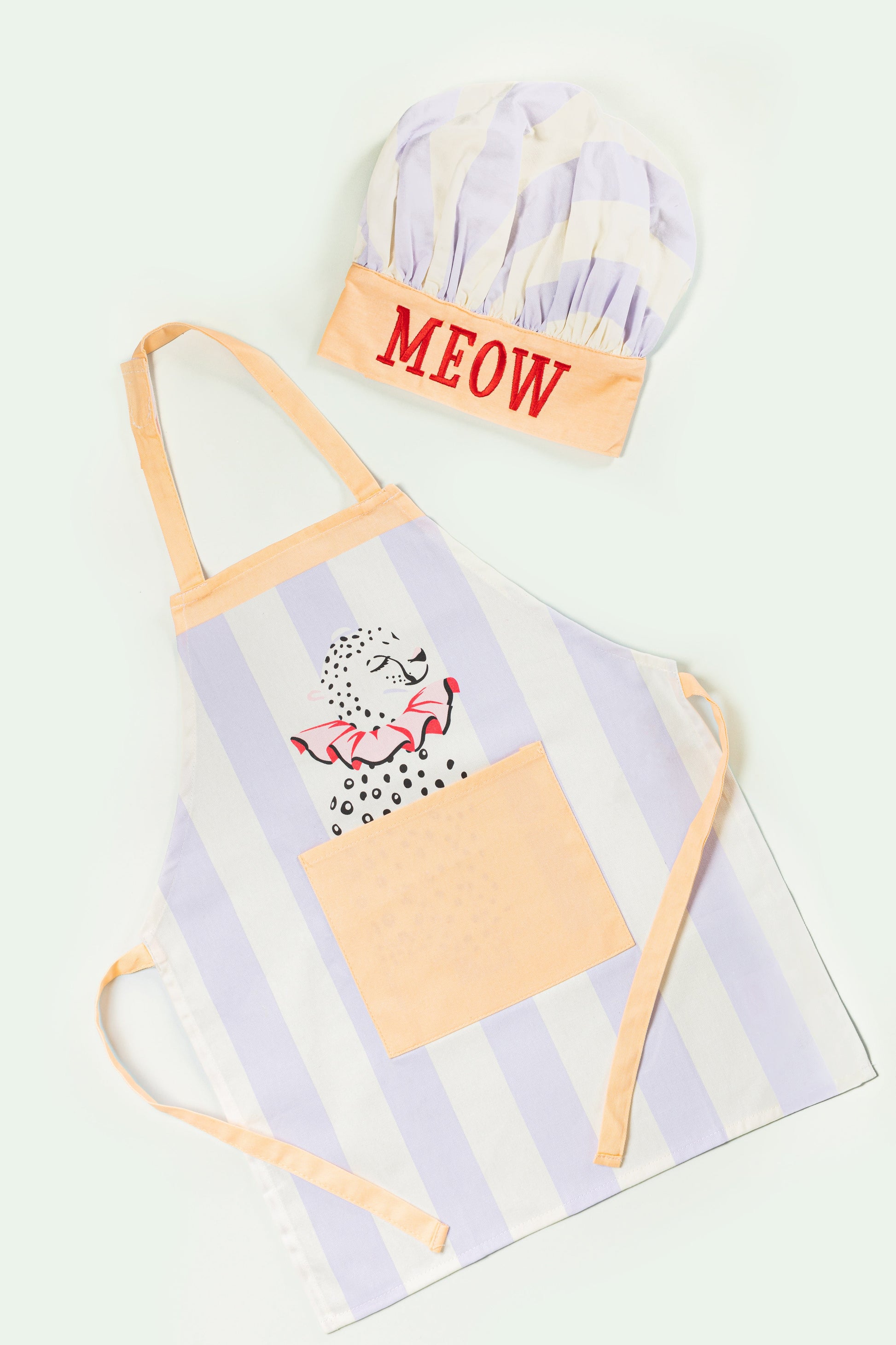 Bring a touch of the wild side to your kiddo's accessories with this fabulous baby cheetah apron and chef hat! Decorated with a cute Yvonne Ellen wild baby cheetah, printed on a lilac and cream stripe background. The apron is finished with peach accents for a touch of quirkiness. How Cute?!