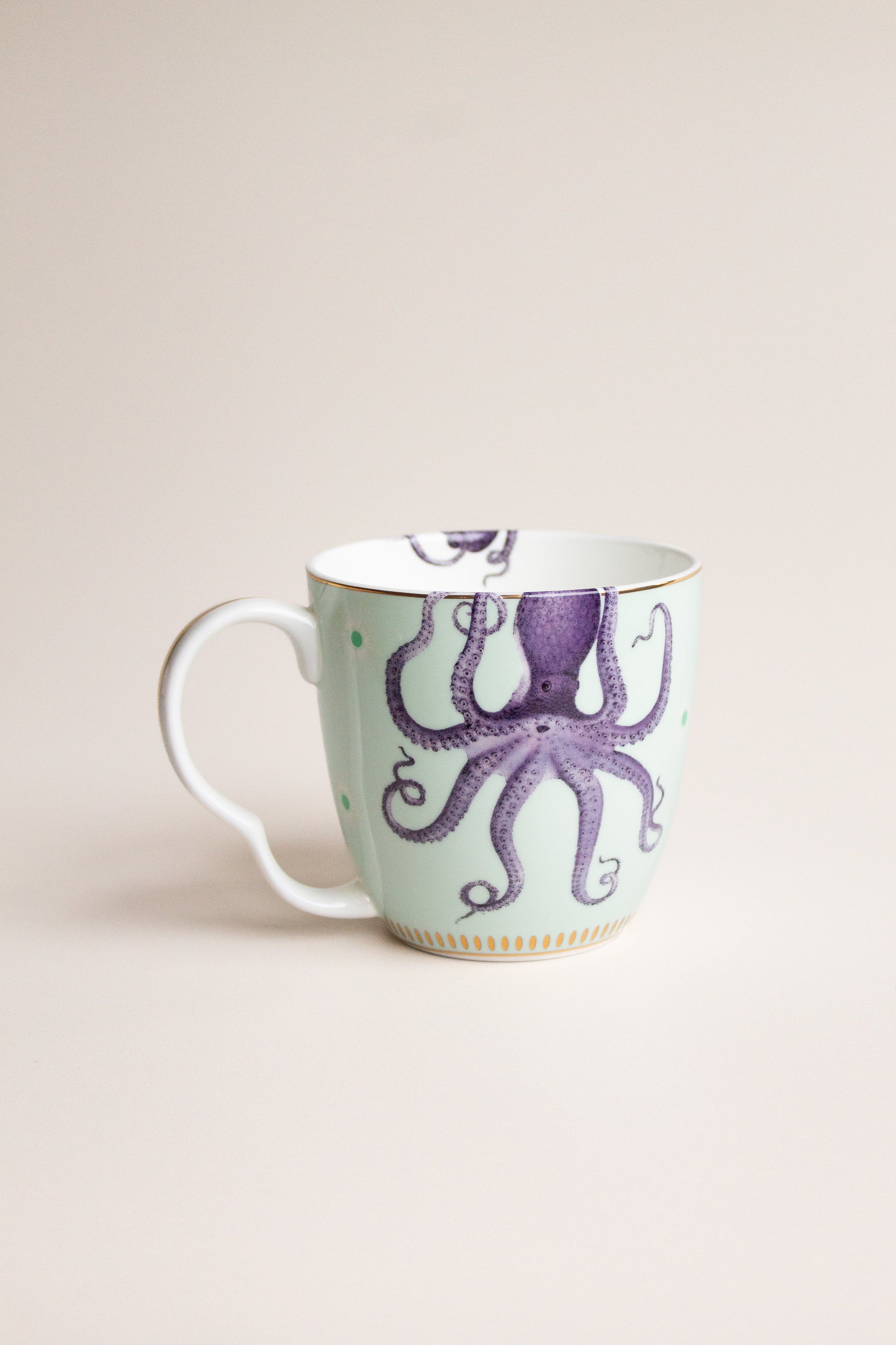 This mug is an ideal gift for birthday's, Christmas or just a way to celebrate your loved ones. This large mug has a pastel mint background, gold detailing and spots for extra elegance! Our charming octopus adorns the sides of the mug and there's a hidden detail inside! The perfect addition to your personal mug collection.