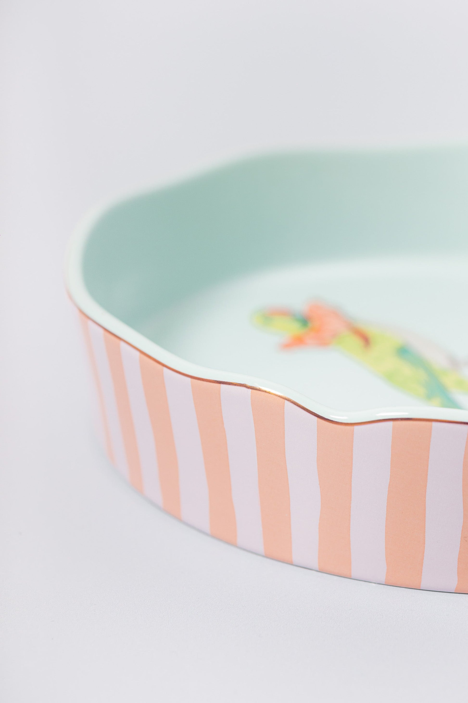 Mix and match with our range of oven dishes to elevate your everyday meals and special occasion dinners. Pink and lilac stripes decorate the side and a mint inner with gold detailing finishes the perfect roaster for your collection.