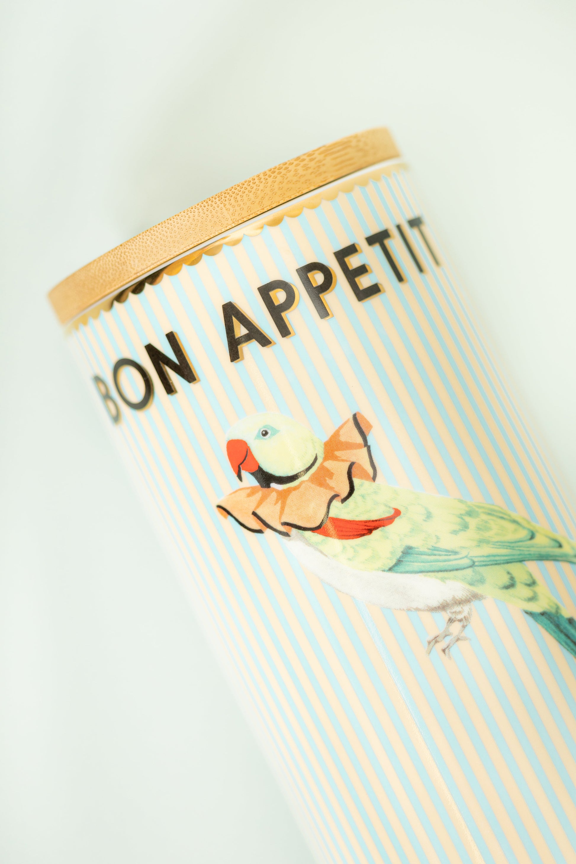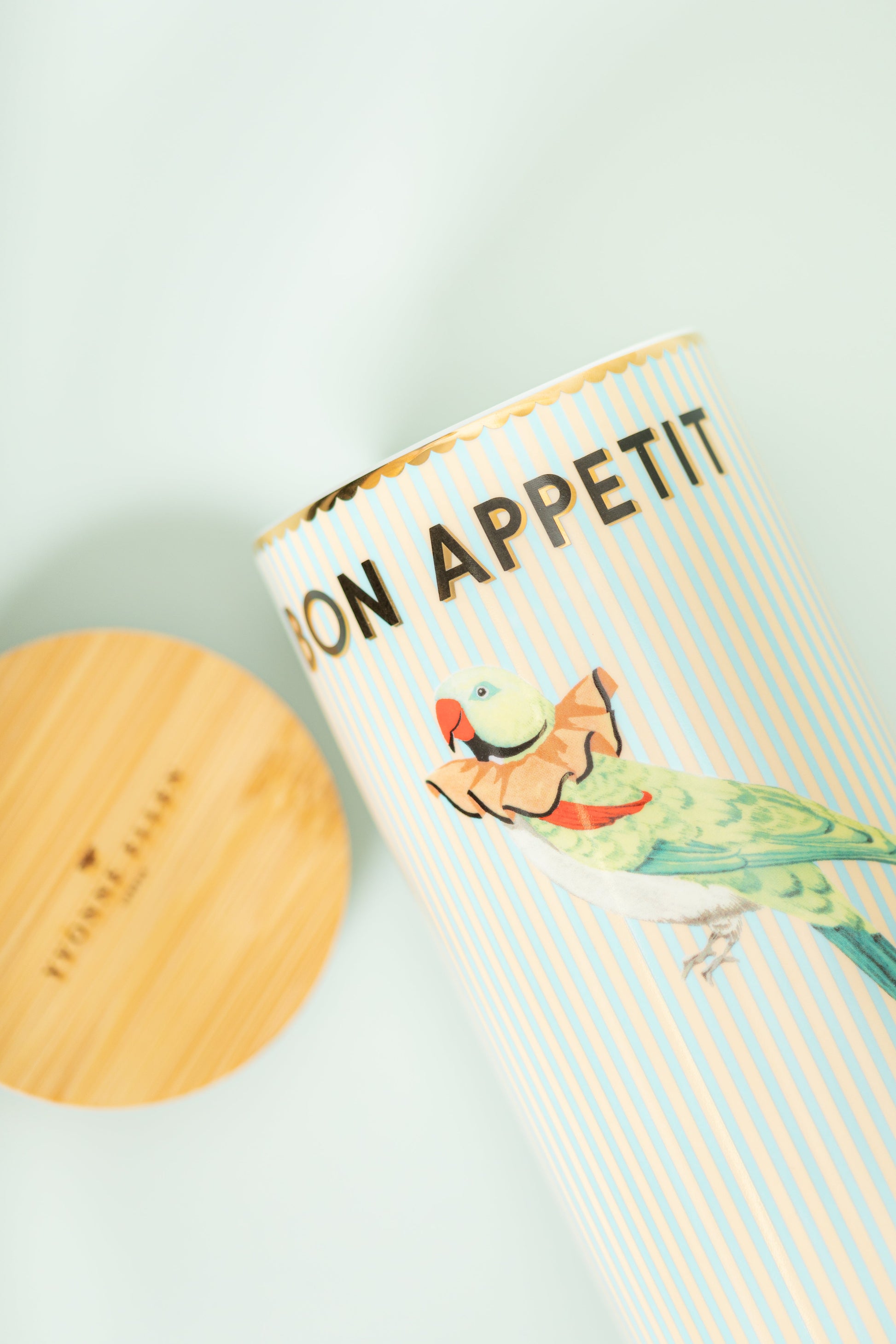 Add our fine china storage jars to your kitchen or bathroom for a stylish storage solution! The bamboo lid fits neatly on the canister, making the Parrot Storage Jar airtight and suitable for storing dried foods, coffee, tea or sugar. Featuring the iconic Yvonne Ellen Parrot illustration on a pastel blue and cream striped background, this jar should take pride of place on your worktop!