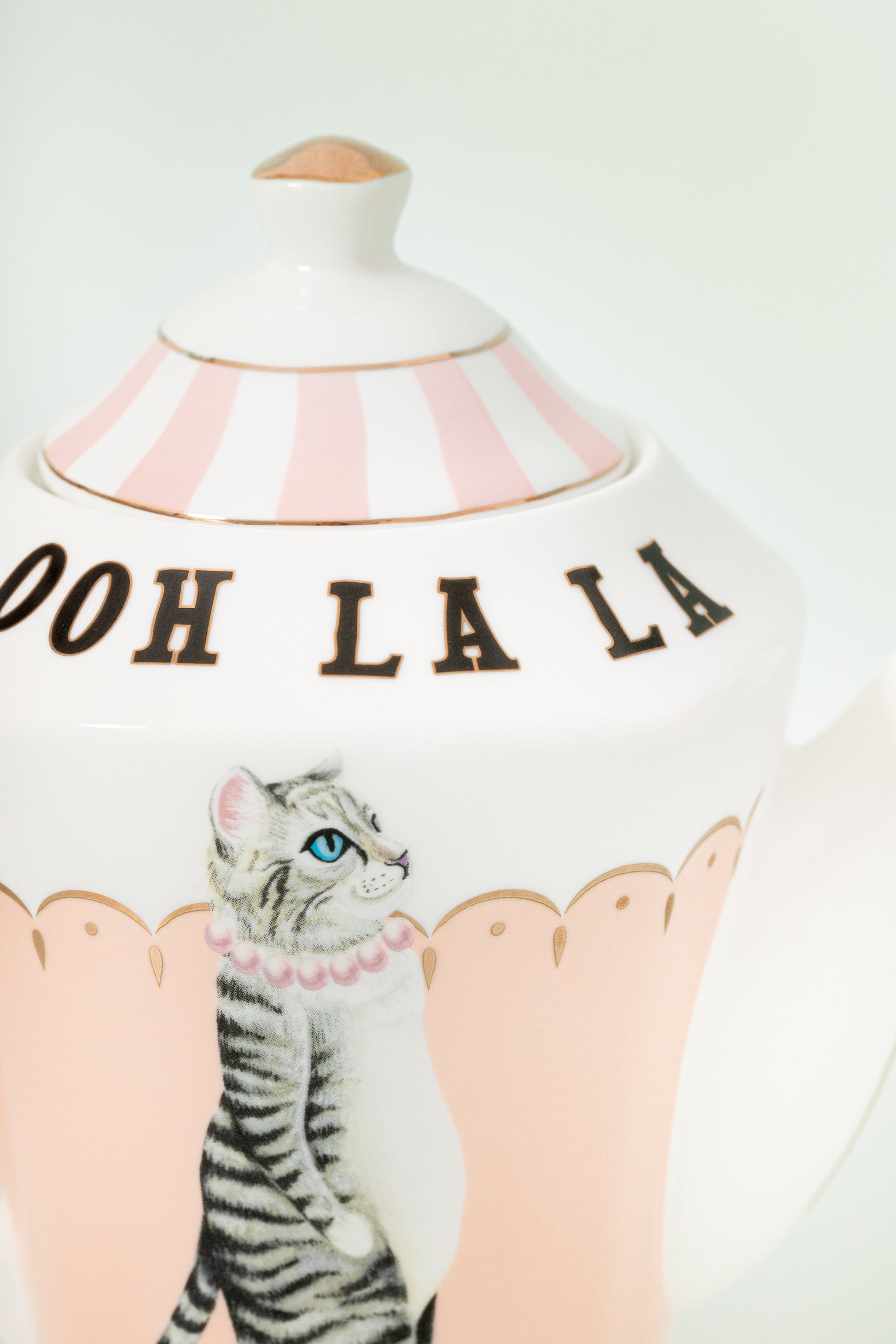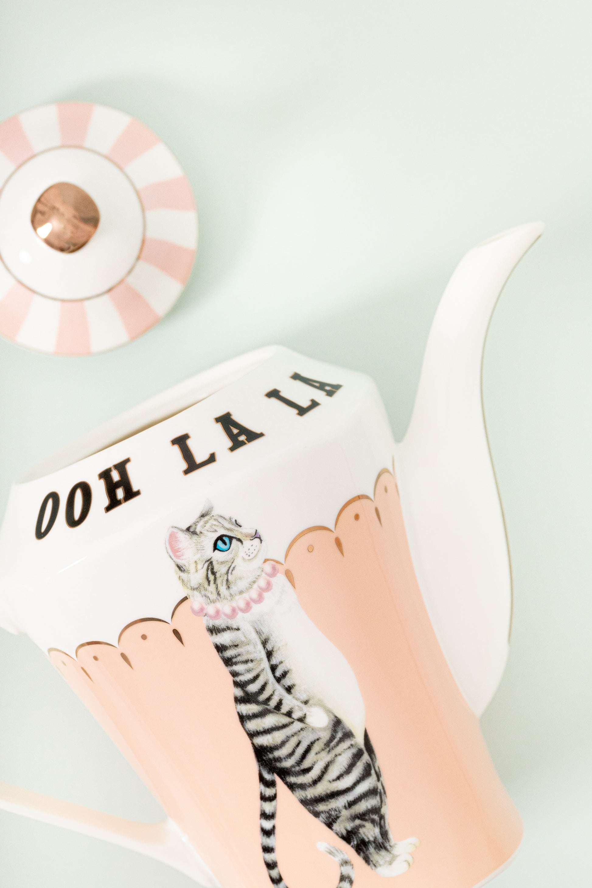 A one of a kind Pussy Teapot with a quirky square shape, pastel coloured design and stretching cat illustration. This unusually shaped pot is the perfect size for 4 - 5 good cups of tea. Pop on a shelf for a stunning display piece.