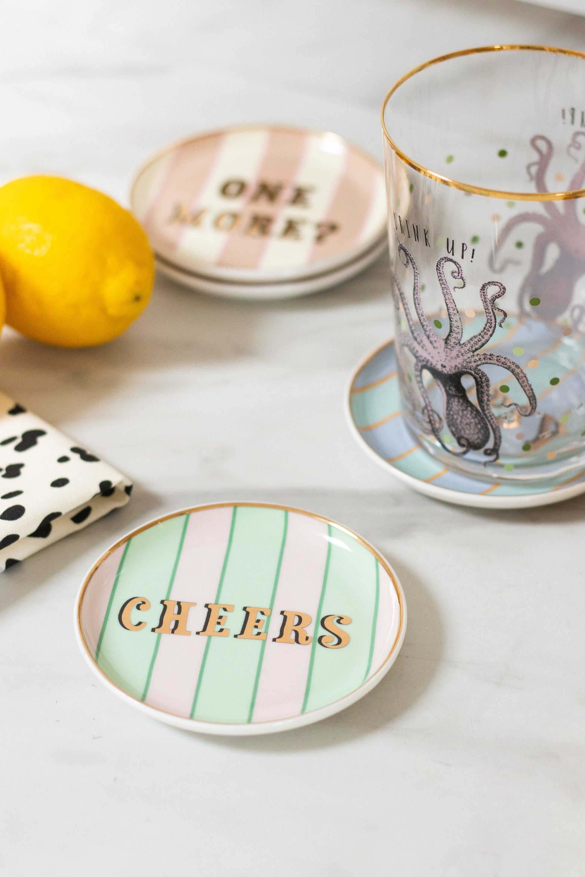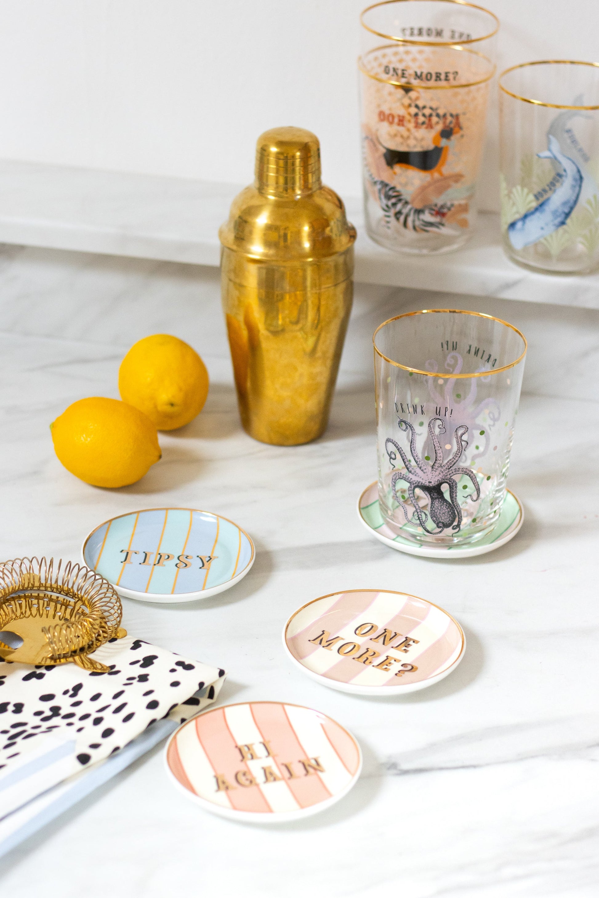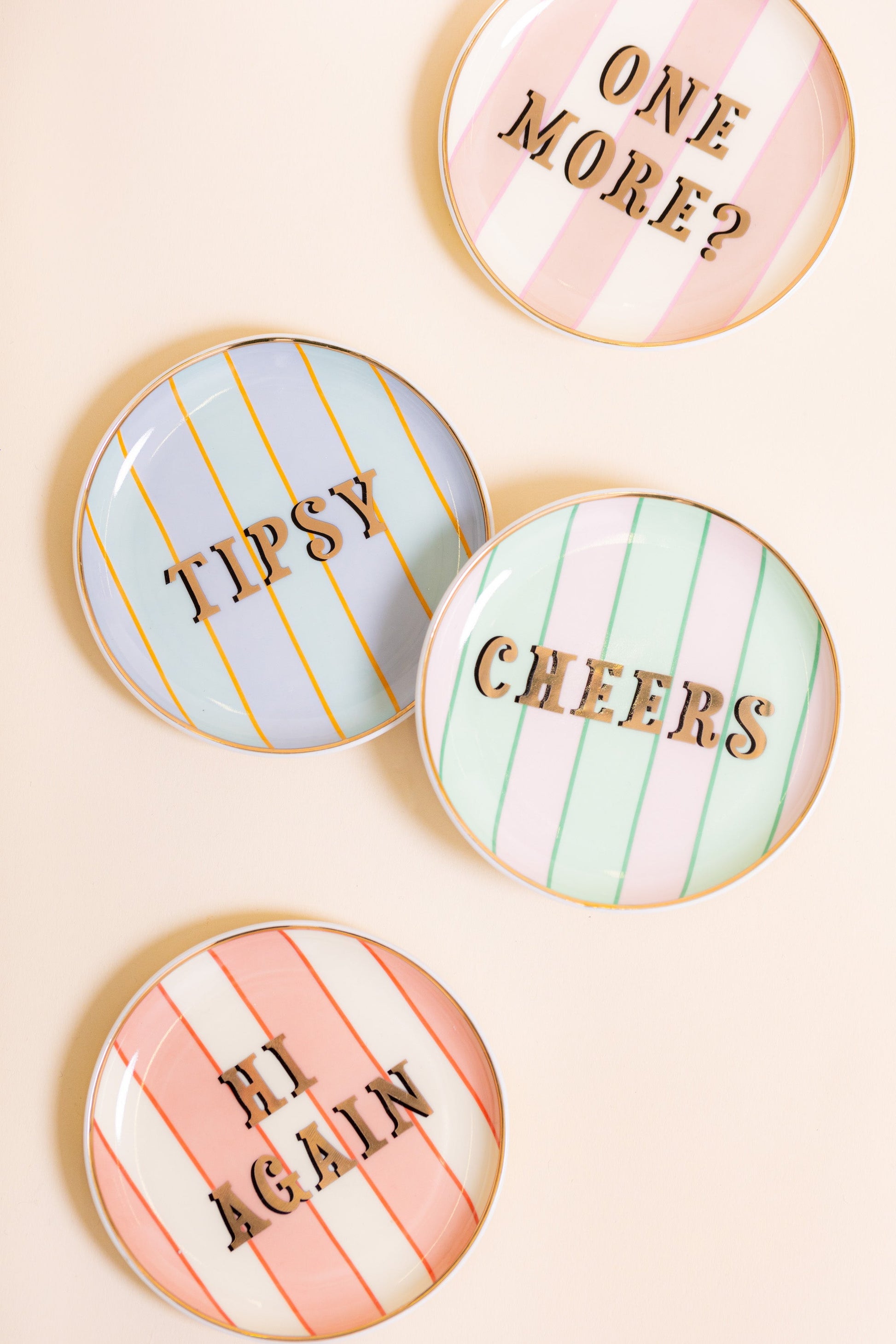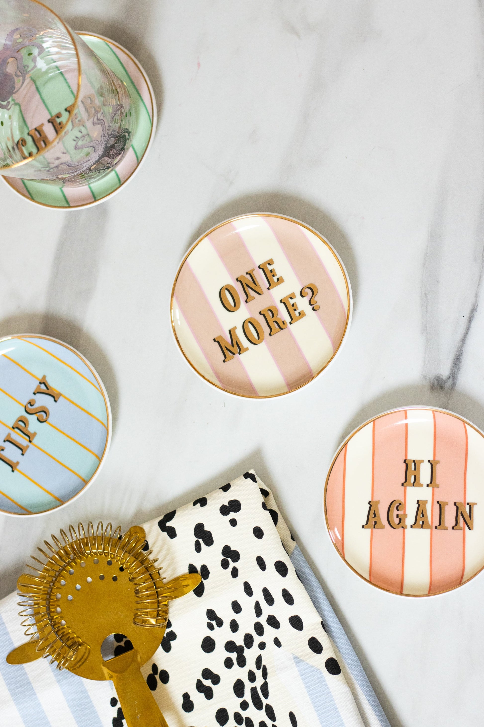 My iconic tipsy slogans are so cute on these coasters!! This set of four coasters will add charm and intrigue to your coffee table with vintage inspired pastel stripes and gold detailing.