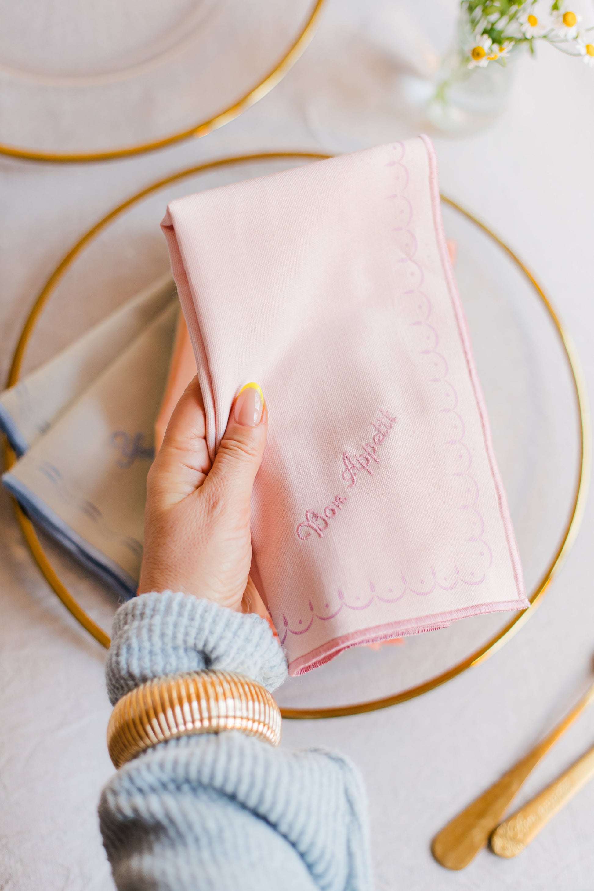 Say hello to my gorgeous pastel embroidered napkins, bringing some quirky charm to the table. Pretty pastels and cheeky slogans, an iconic Yvonne Ellen combo! Matching placemats available!