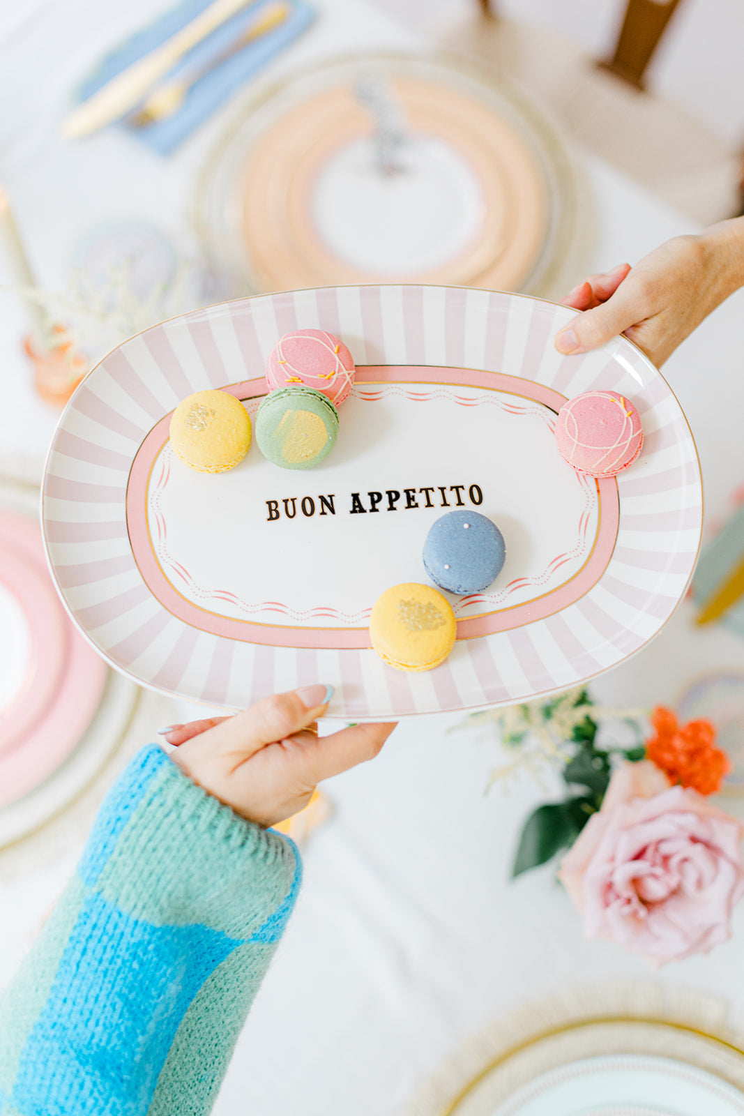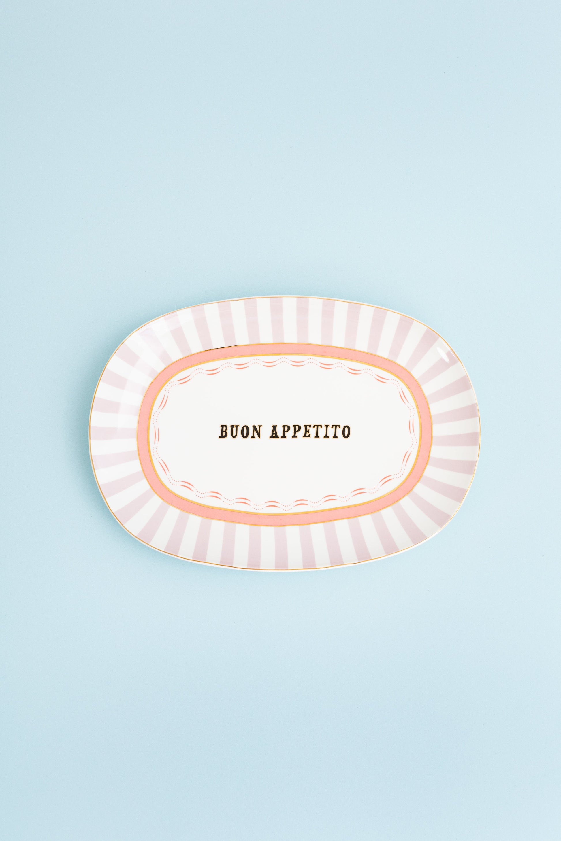 What a stunner! Perfect for pastel lovers, this slogan platter is sure to be a showstopper on your table. Purple stripes line the edge of the platter and cutesy pink detail sits on the inner rim of the platter. Our favourite 'Buon Appetito' slogan adorns the middle of the plate in black writing, wrapped with luxurious gold detailing.