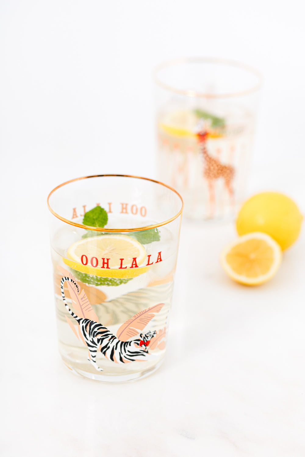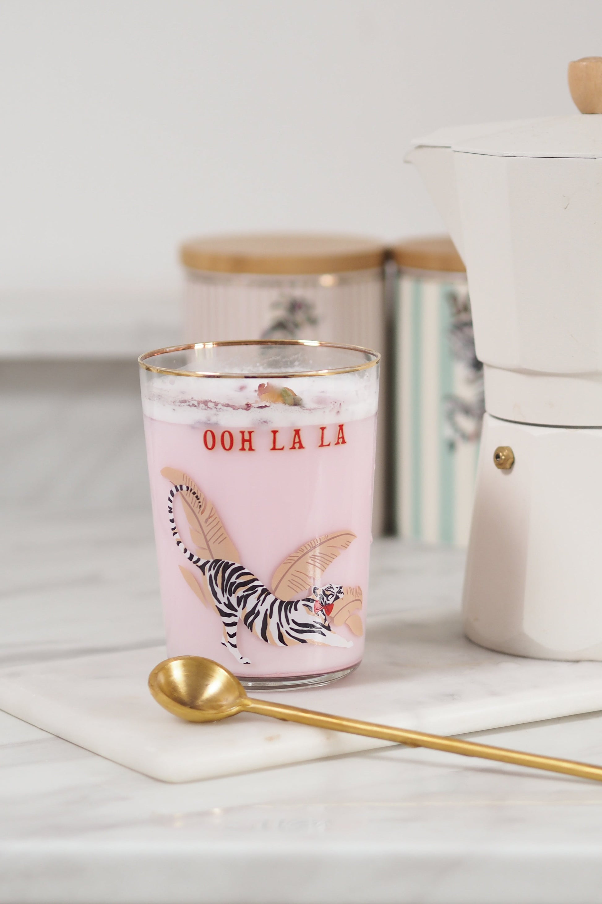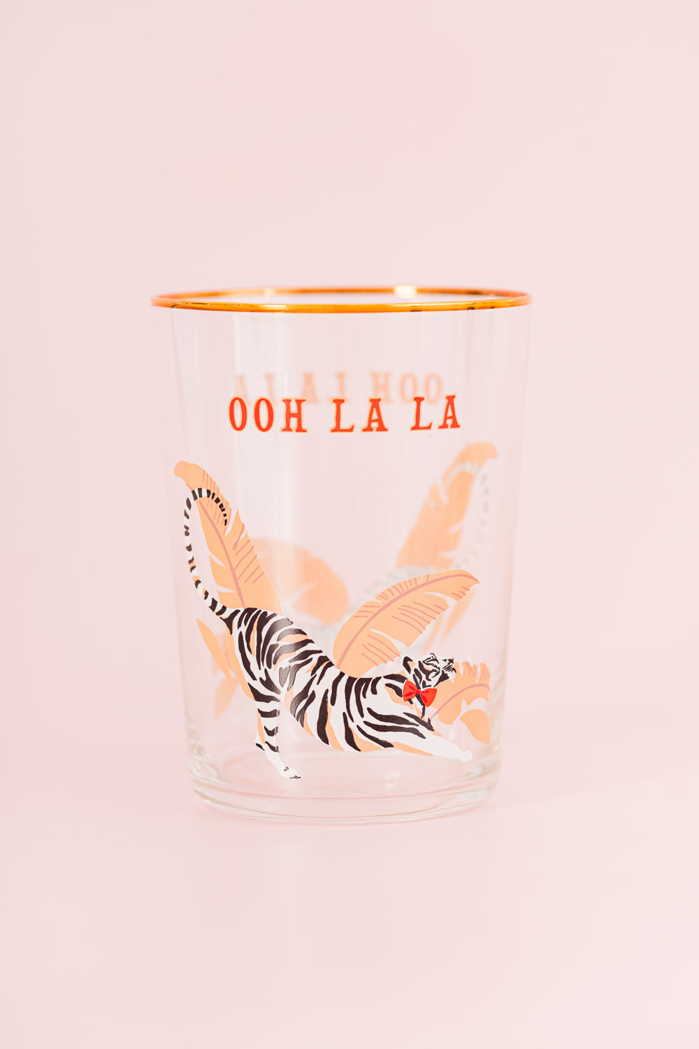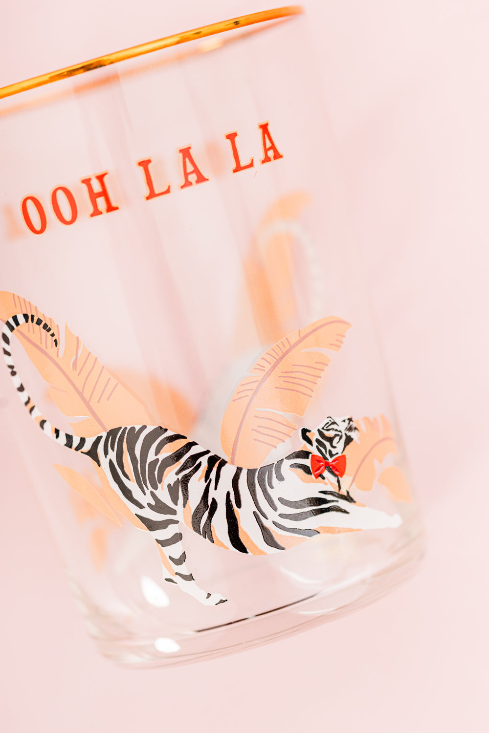 Unique and luxurious Yvonne Ellen Tiger glass complete with gilt gold edge detailing and colourful animal illustrations.