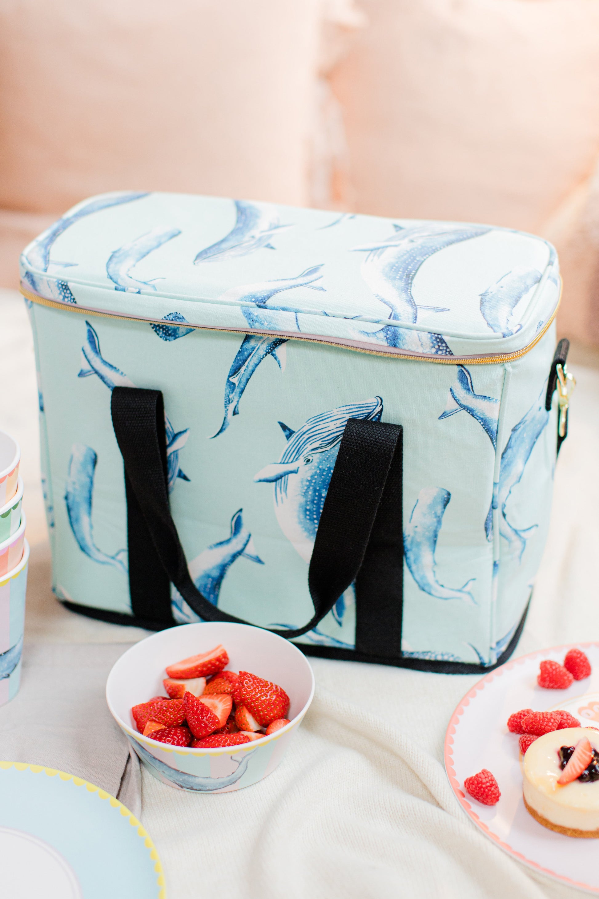Take your picnic game to the next level with our sophisticated and elegant Yvonne Ellen Whale Cooler Bag. Not only is it lined with a wipe clean fabric to keep your food fresh and cool, but the blue whale fabric and gold zipper detail add a playful touch. Easily carry it with the two handy straps.