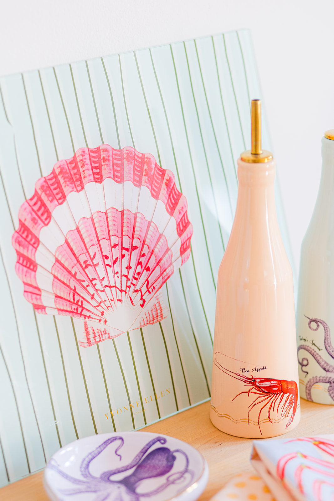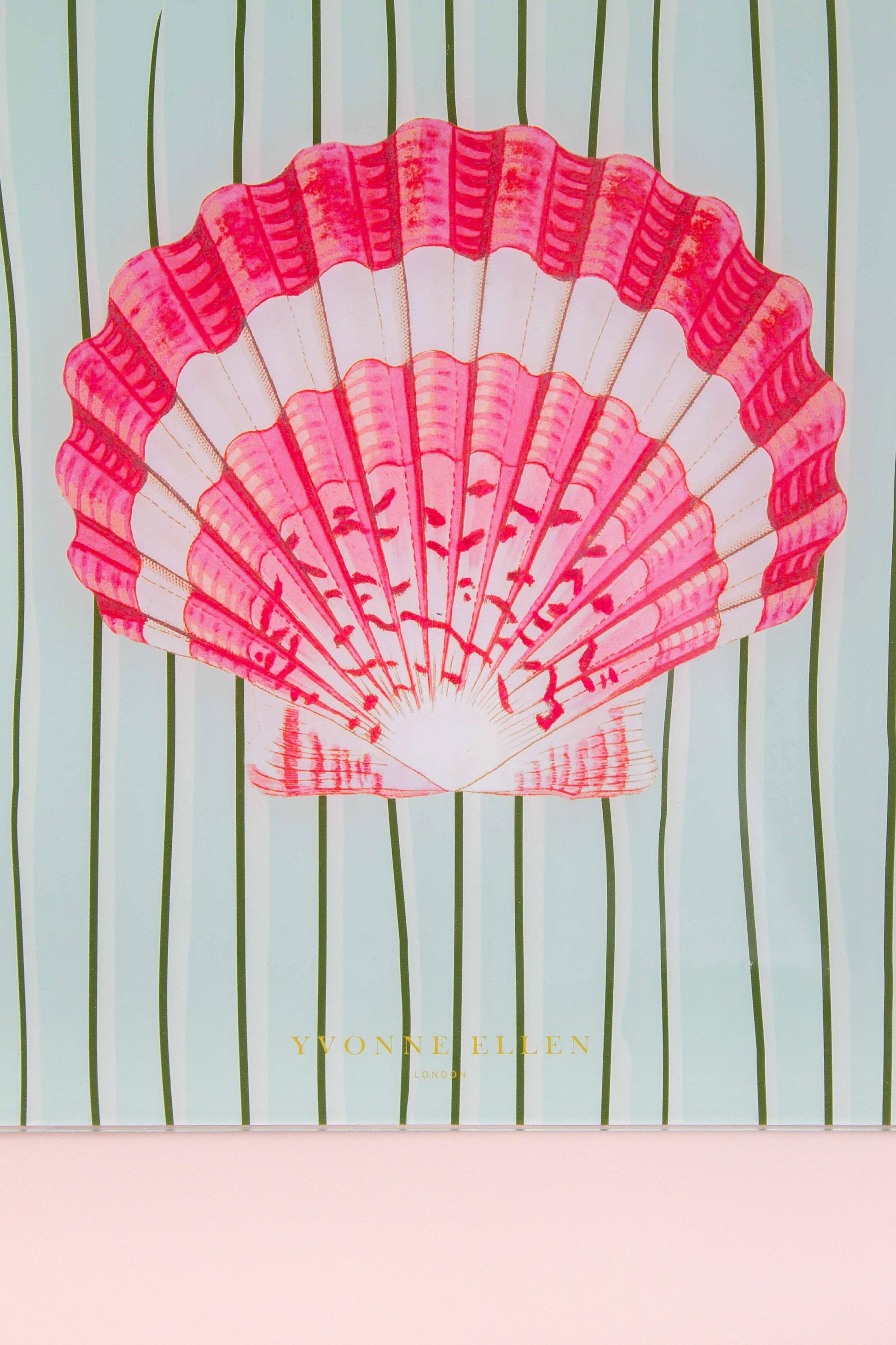 My Seashell illustration is finally on a gorgeous glass worktop saver, with a stylish green striped background and gold Yvonne Ellen logo. It's perfect for adding a coastal charm as an essential addition to any kitchen.