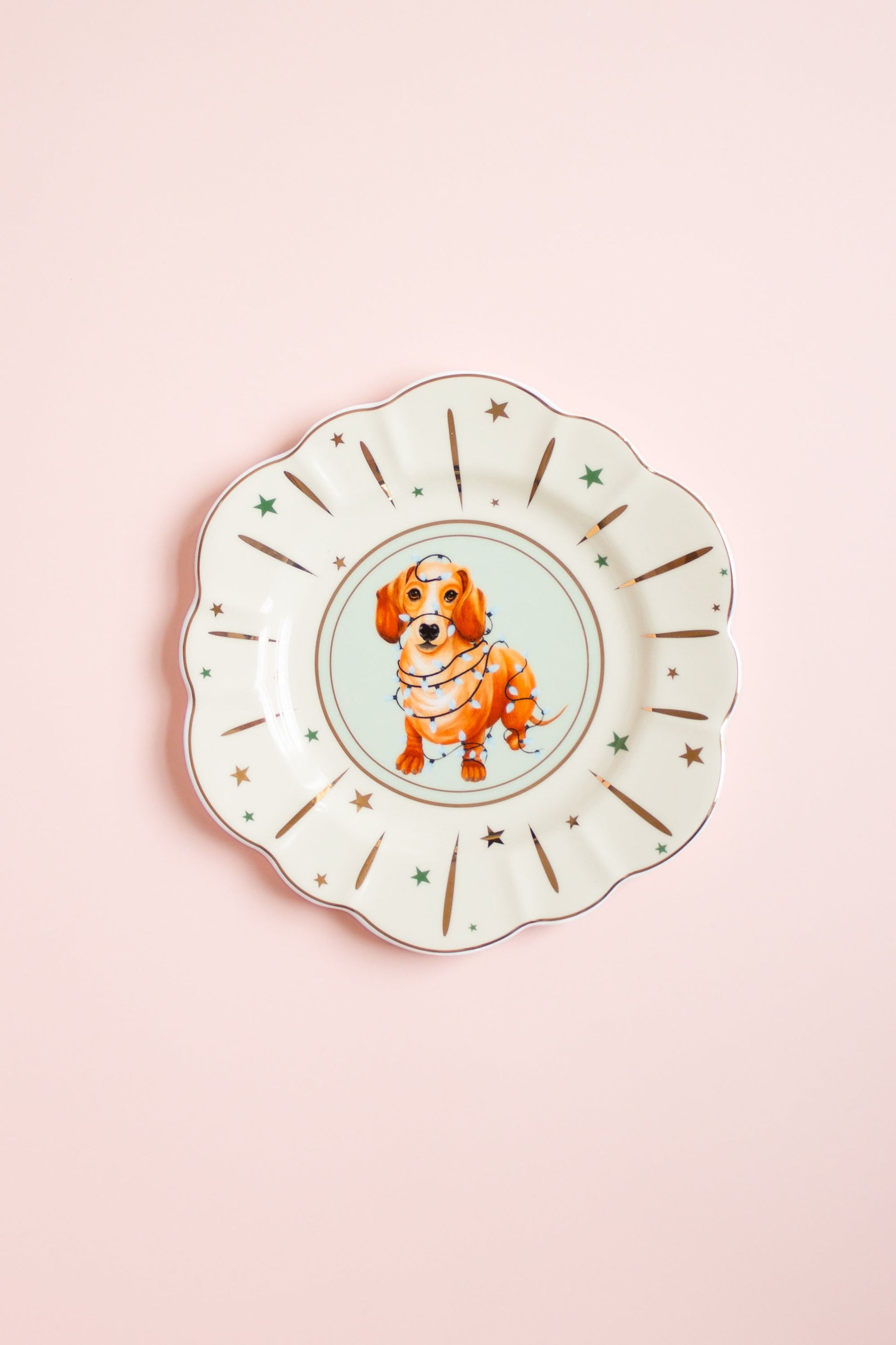 With a charming sausage doggie wrapped in fairy lights, this vintage style sandwich plate is perfect for elevating your dining experience. Finished with gold detailing, this plate is the perfect addition to your table - what a cutie!