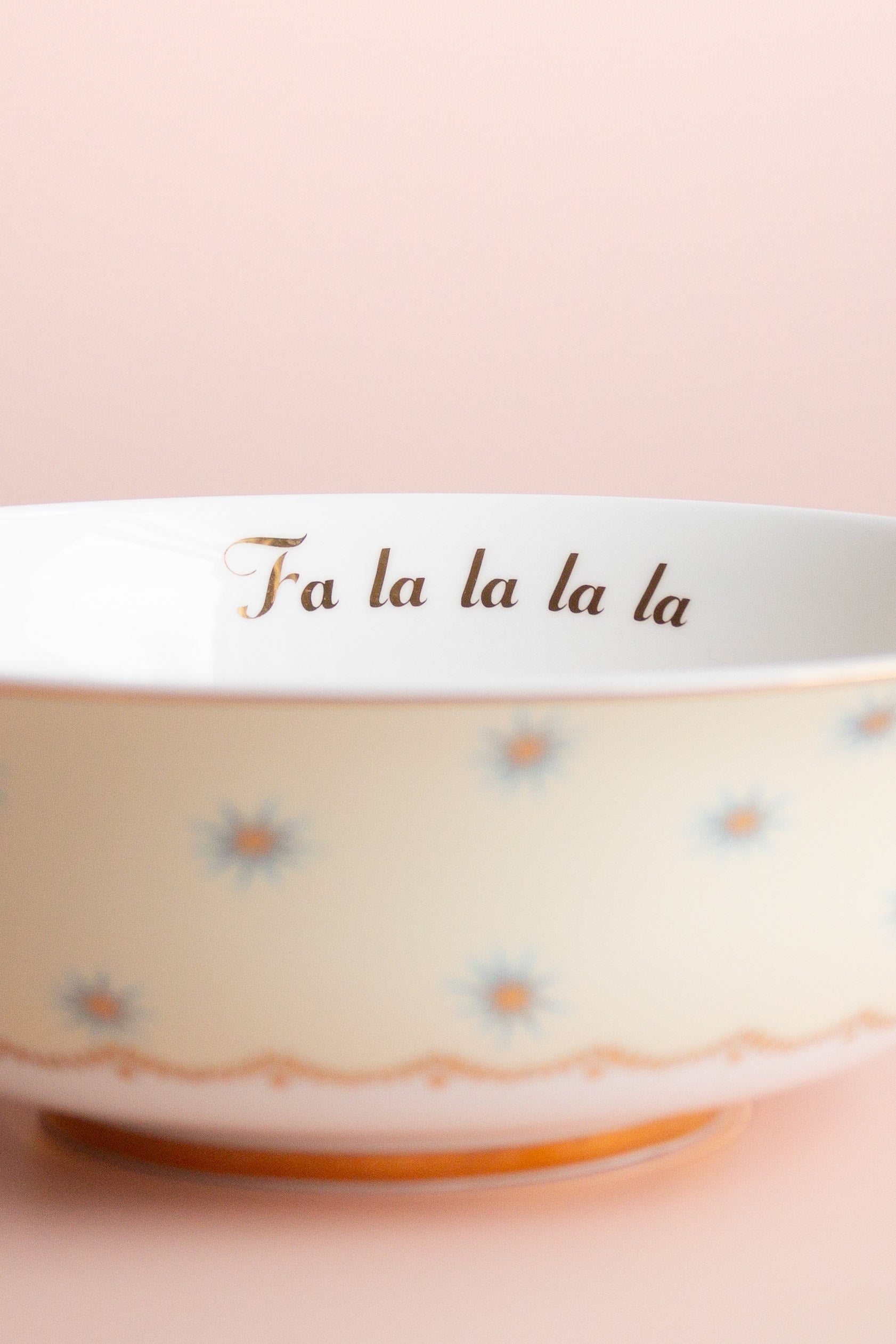 Add a touch of festive charm to your table with our China Serving Bowl. Adorned with an adorable squirrel illustration and highlighted by "Fa La La La La" gold detailing, this bowl is perfect for holiday gatherings and everyday use. Crafted from high-quality china, it combines durability with elegance, making it a delightful centrepiece for your culinary creations. Serve up style and joy with this cute serving bowl.